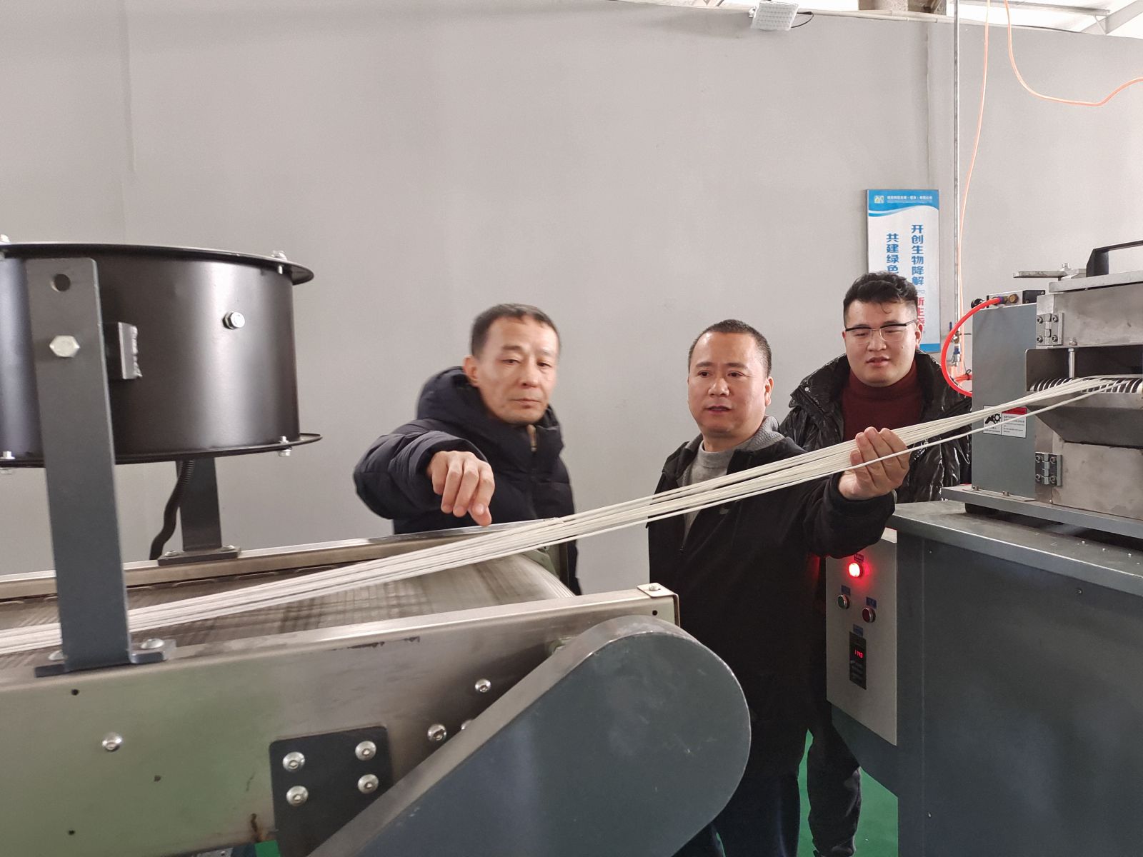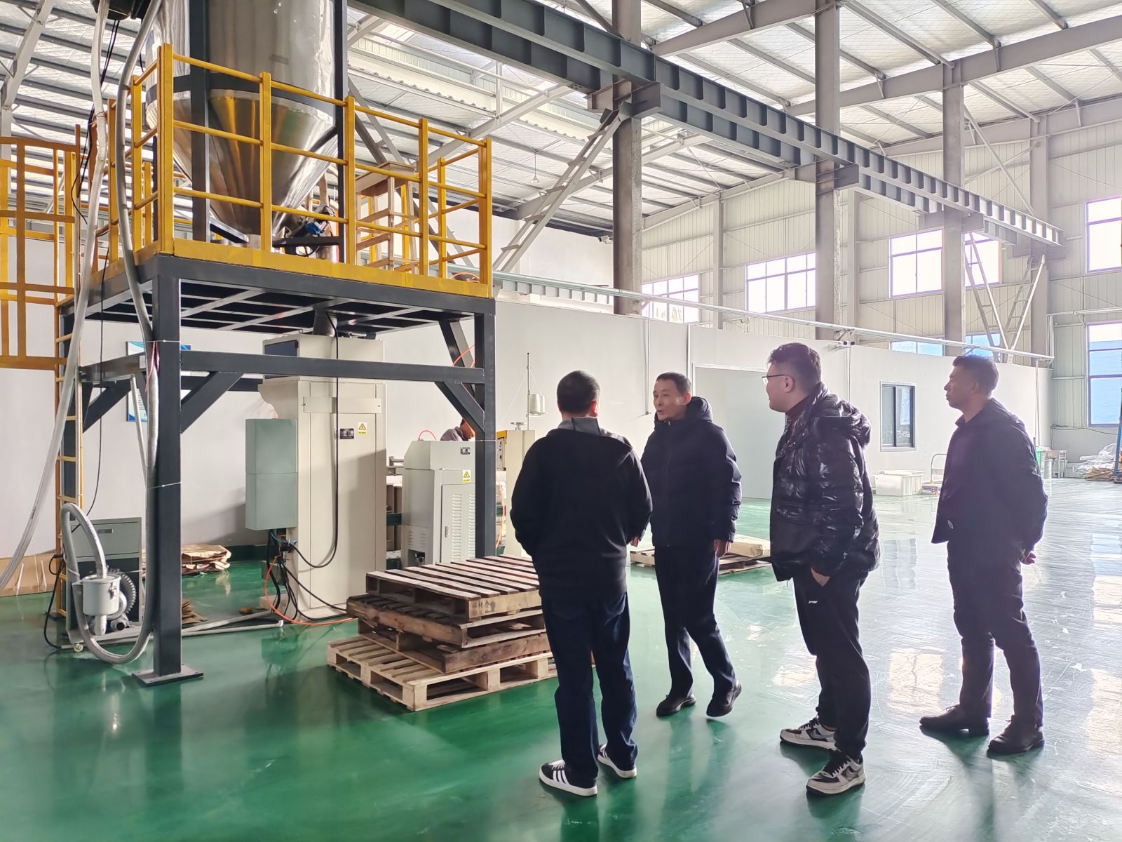 上午,張憲方總監(jiān)一行參觀了創(chuàng)新中心德清產(chǎn)業(yè)化基地。基地負責人許洪根介紹了車間生產(chǎn)及經(jīng)營管理情況,雙方就全降解改性材料的生產(chǎn)設備、工藝流程、技術特點等方面進行了全方面交流。